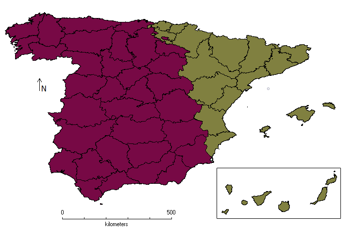En rojo, provincias españolas sujetas al Interrogatorio del Catastro del Marqués de la Ensenada entre 1750 y 1754.