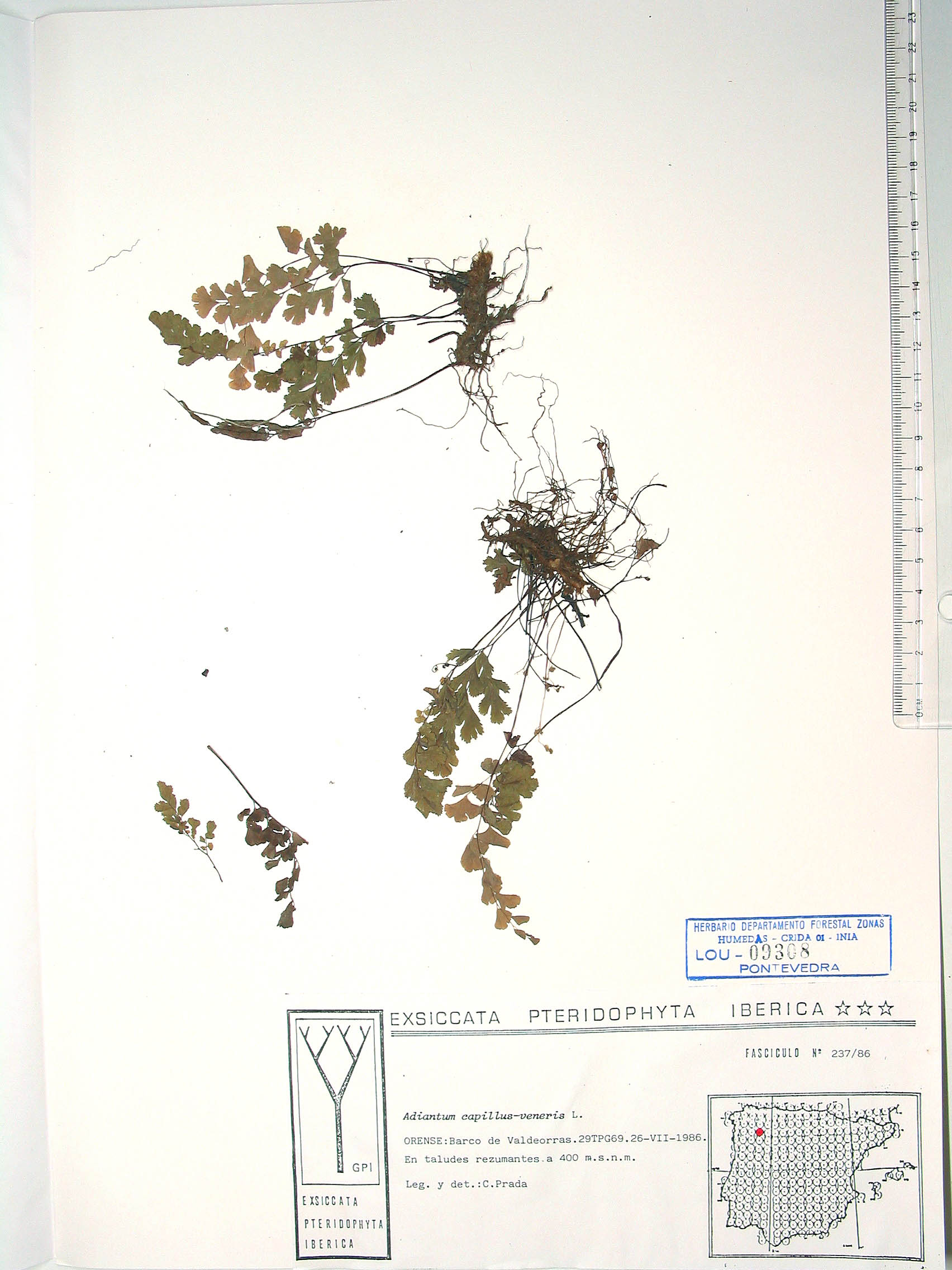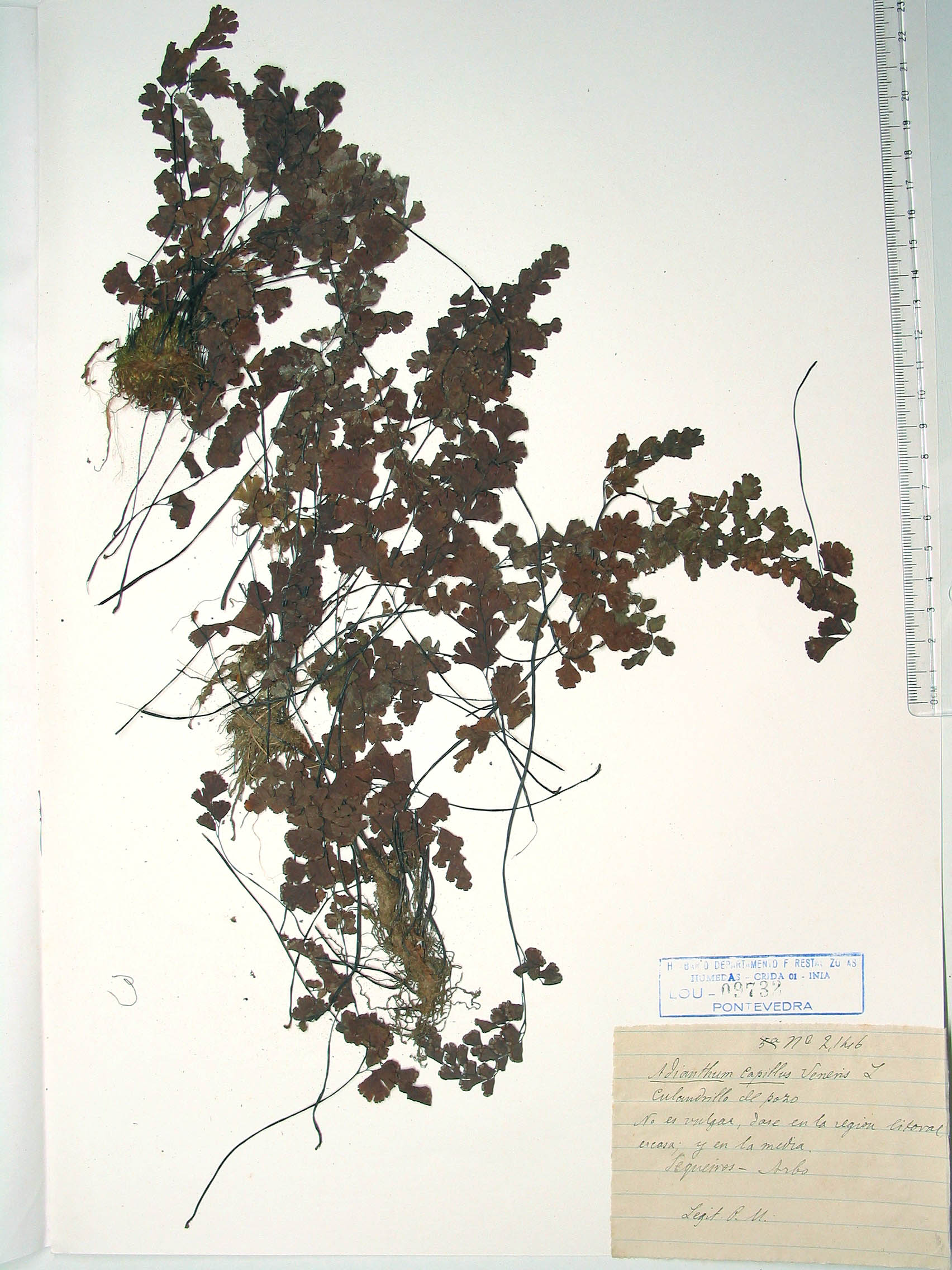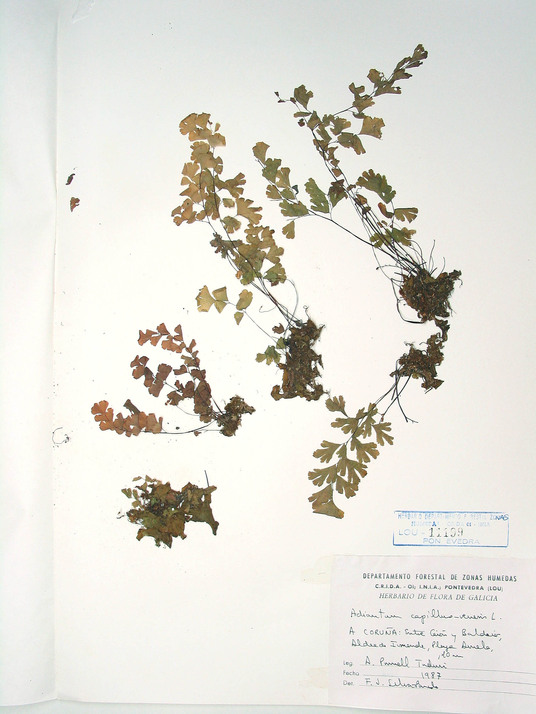 Adiantum capillus-veneris L. Haud frequens in Gallaecia. Sequeiros. San Esteban. Vía férrea. Montefurado B. Merino, LOU 09733
