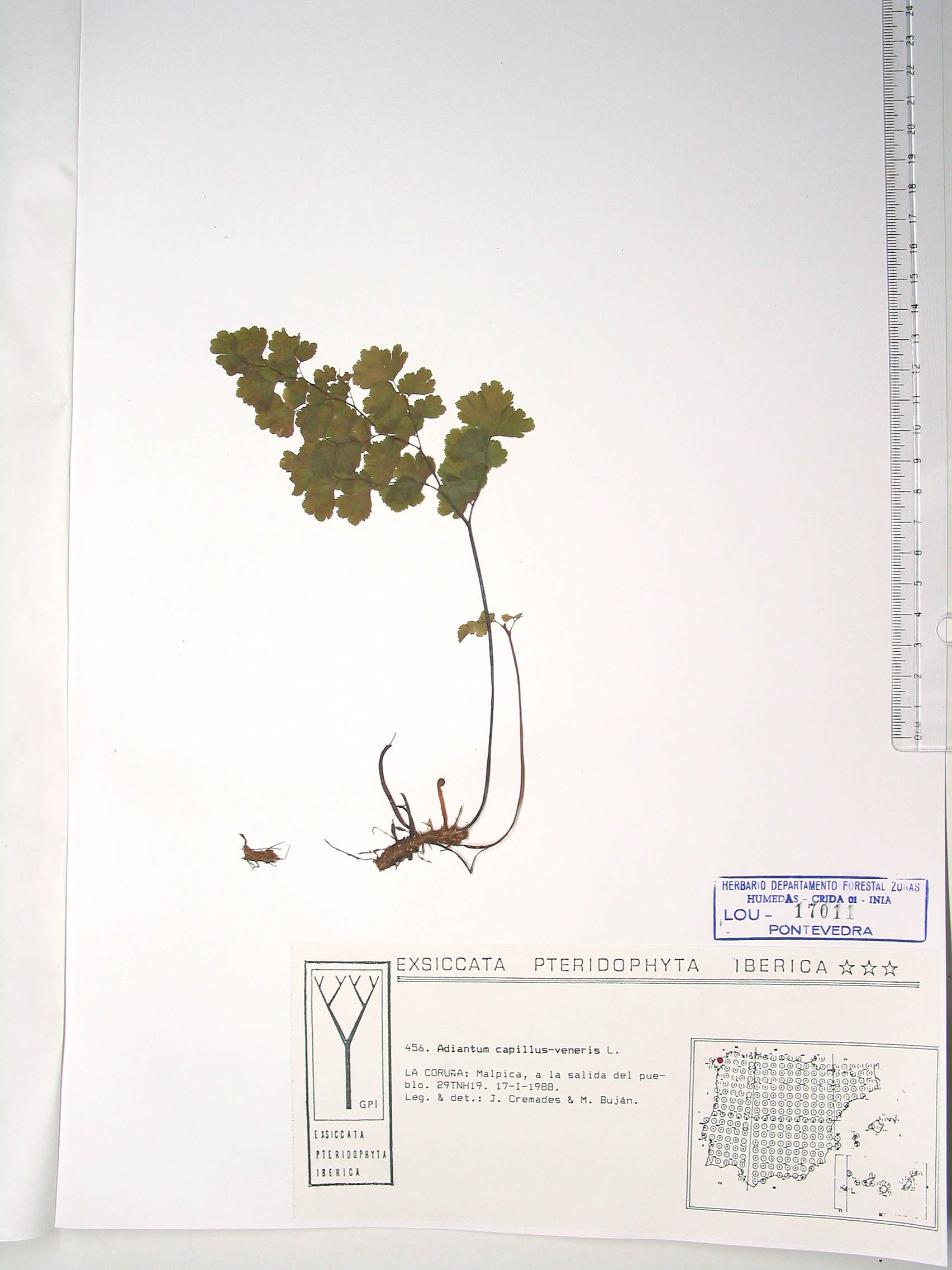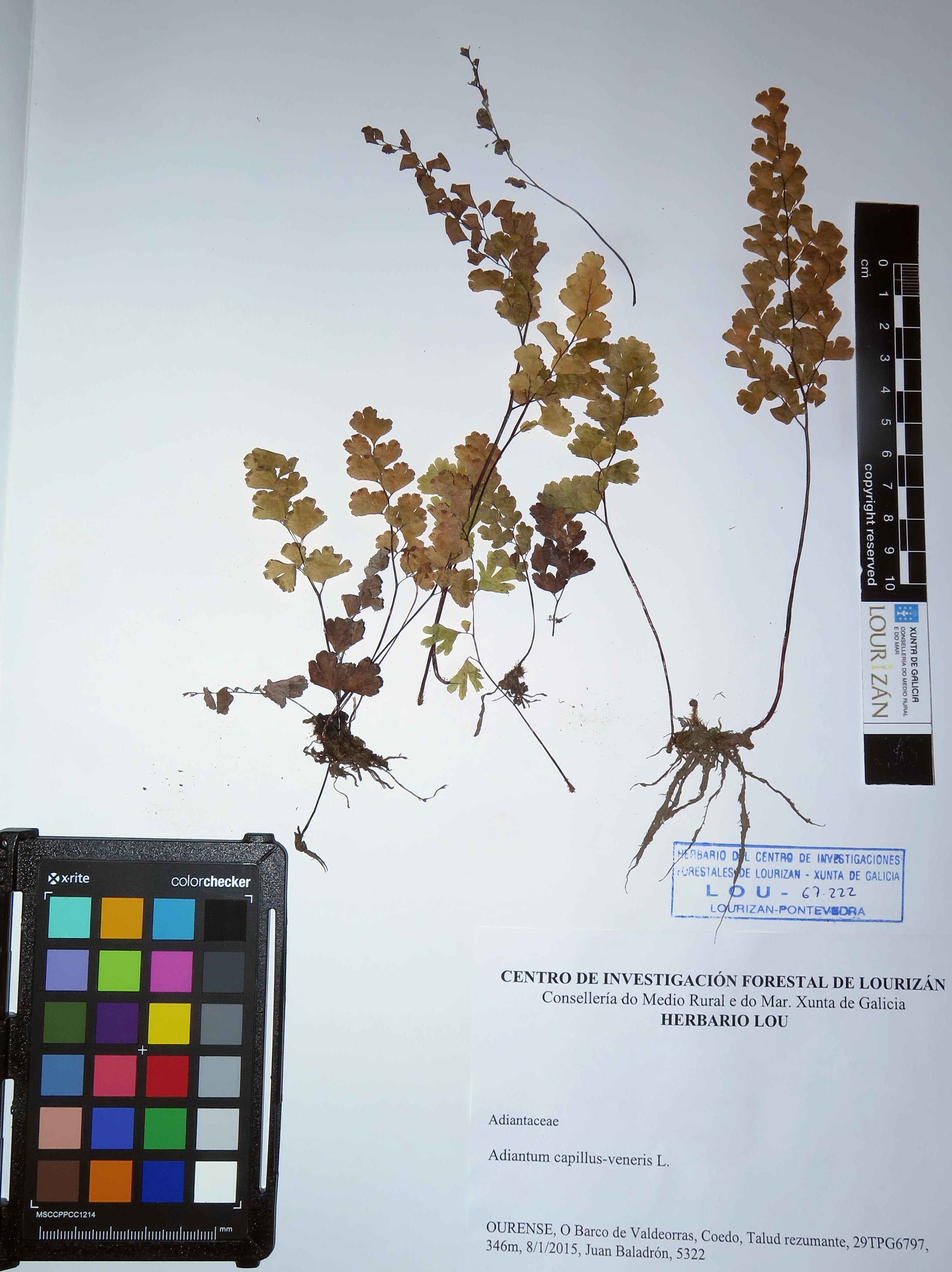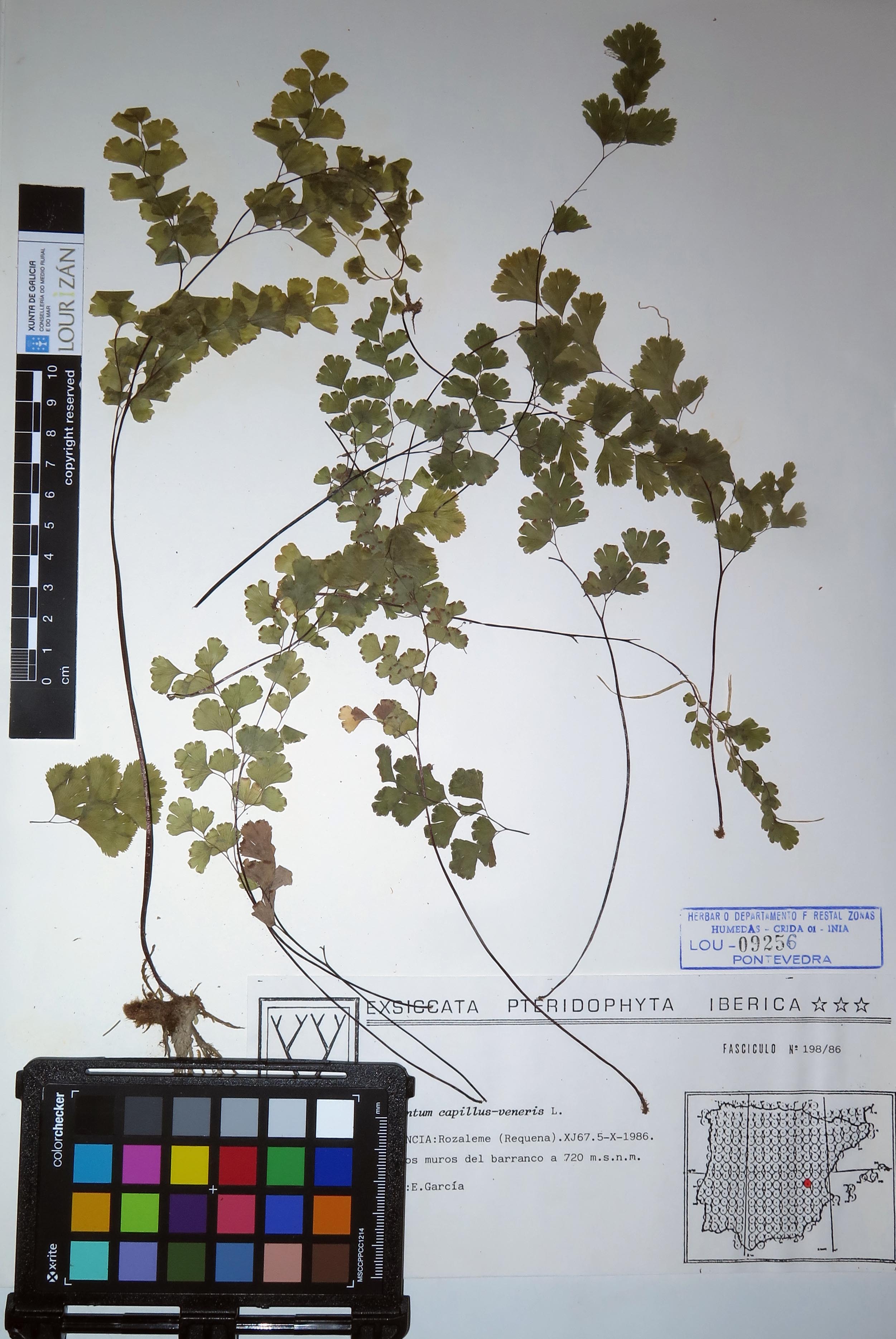 Adiantum capillus-veneris L. Haud frequens in Gallaecia. Sequeiros. San Esteban. Vía férrea. Montefurado B. Merino, LOU 09733