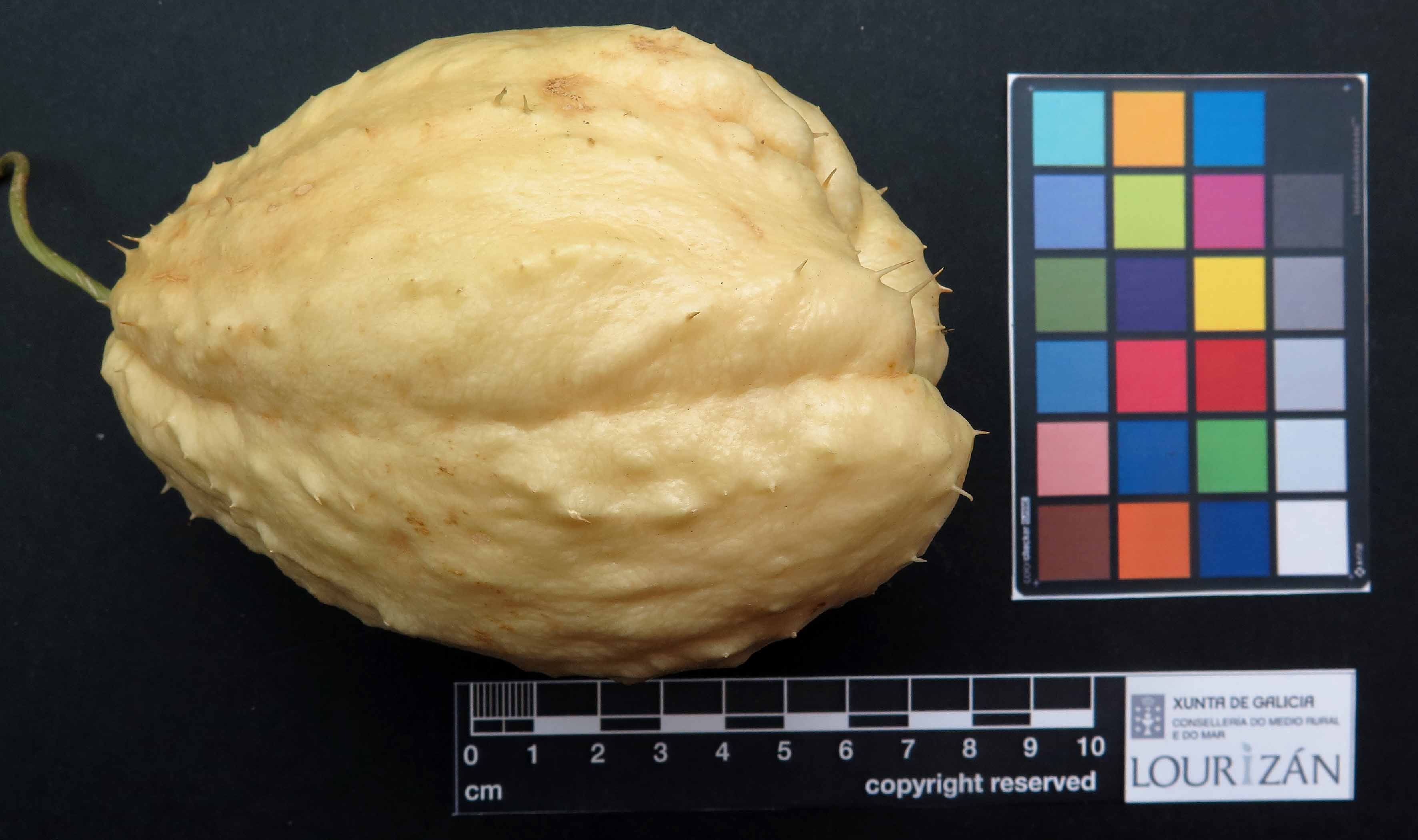 Fruto de color amarillo de Sechium edule (Jacq.) Sw. (Darbo, Cangas, Pontevedra).